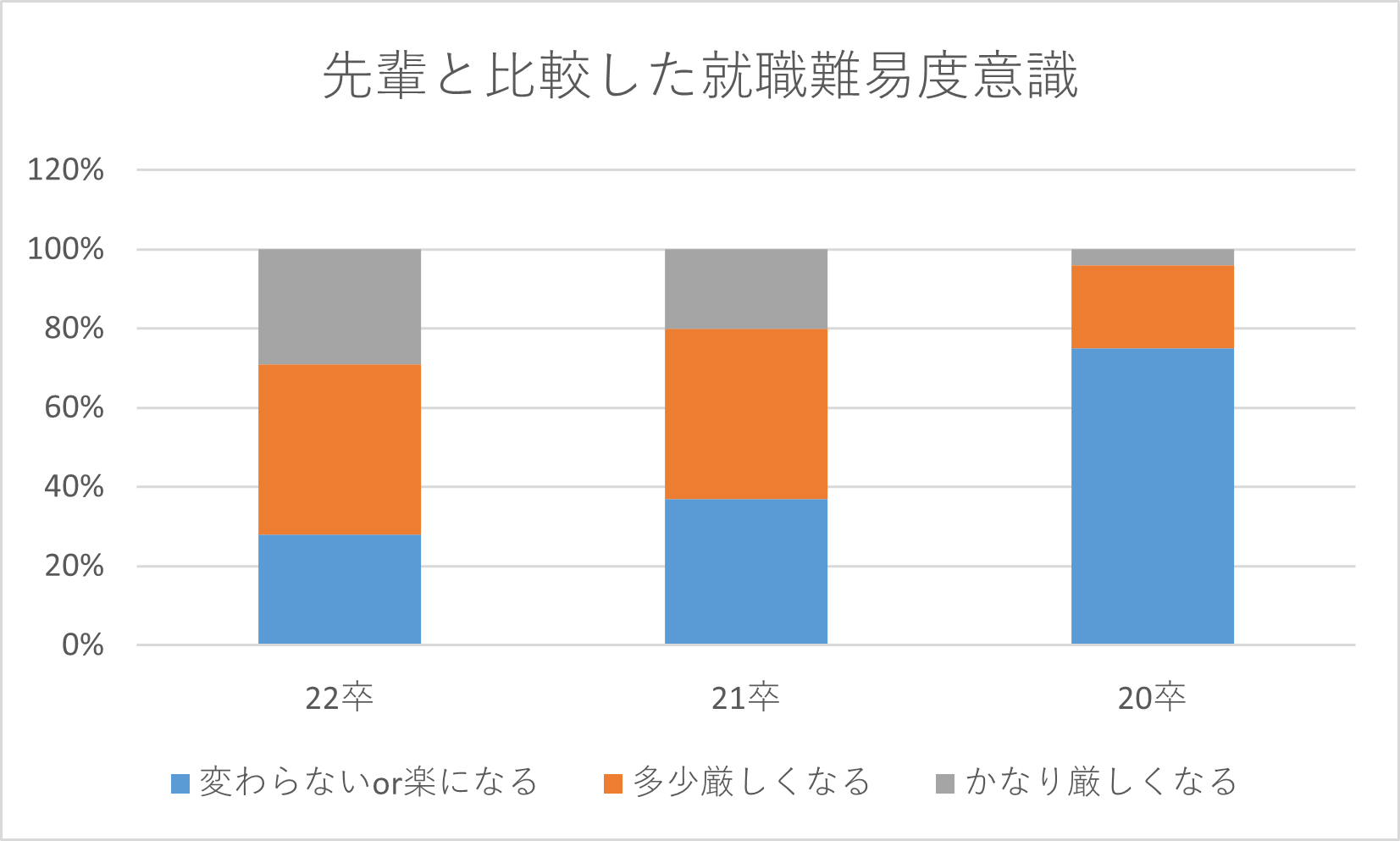 また新社会人の彼らは就職活動をするのにあたって、先輩との比較論で難易度が高いと思っているのでしょうか?低いと思っているのでしょうか?下記図をご覧ください。