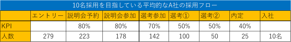 うまくいくとは、採用目標人数の達成です。10名採用を仮定した際に、実際にそれを達成するためのプロセスと現在それを従来の方法で達成できる環境なのか?というところをデータから読み取っていきます。今回は前提として10名採用を目指している中央値に位置するA社として分析します。