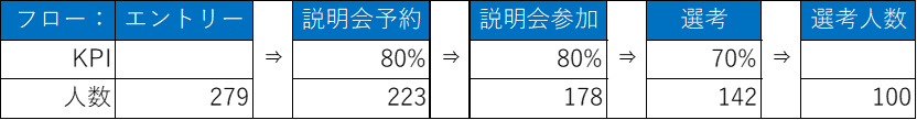 これは個社ごとにかなり差が出てきますが、ここでは離脱が50%になる選考を2回行う、つまり25%だとします。つまり10名採用の場合、選考しなければならない人数は100名になります。