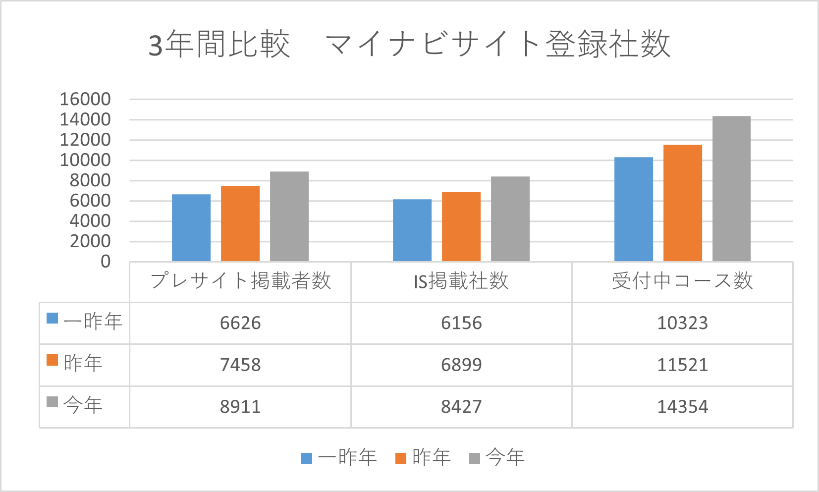 原因としては上記図を見て頂くとわかるように、概ねどのパターンでも企業の数が前年比120%になっており単純に新卒採用を再開する企業が増加している事が分かります。また、下記図もご覧下さい。